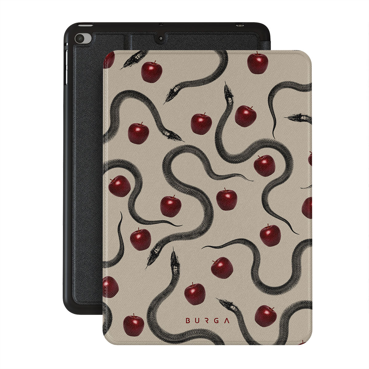 Ce design présente : des pommes rouges brillantes, des serpents enroulés, des tons beige.