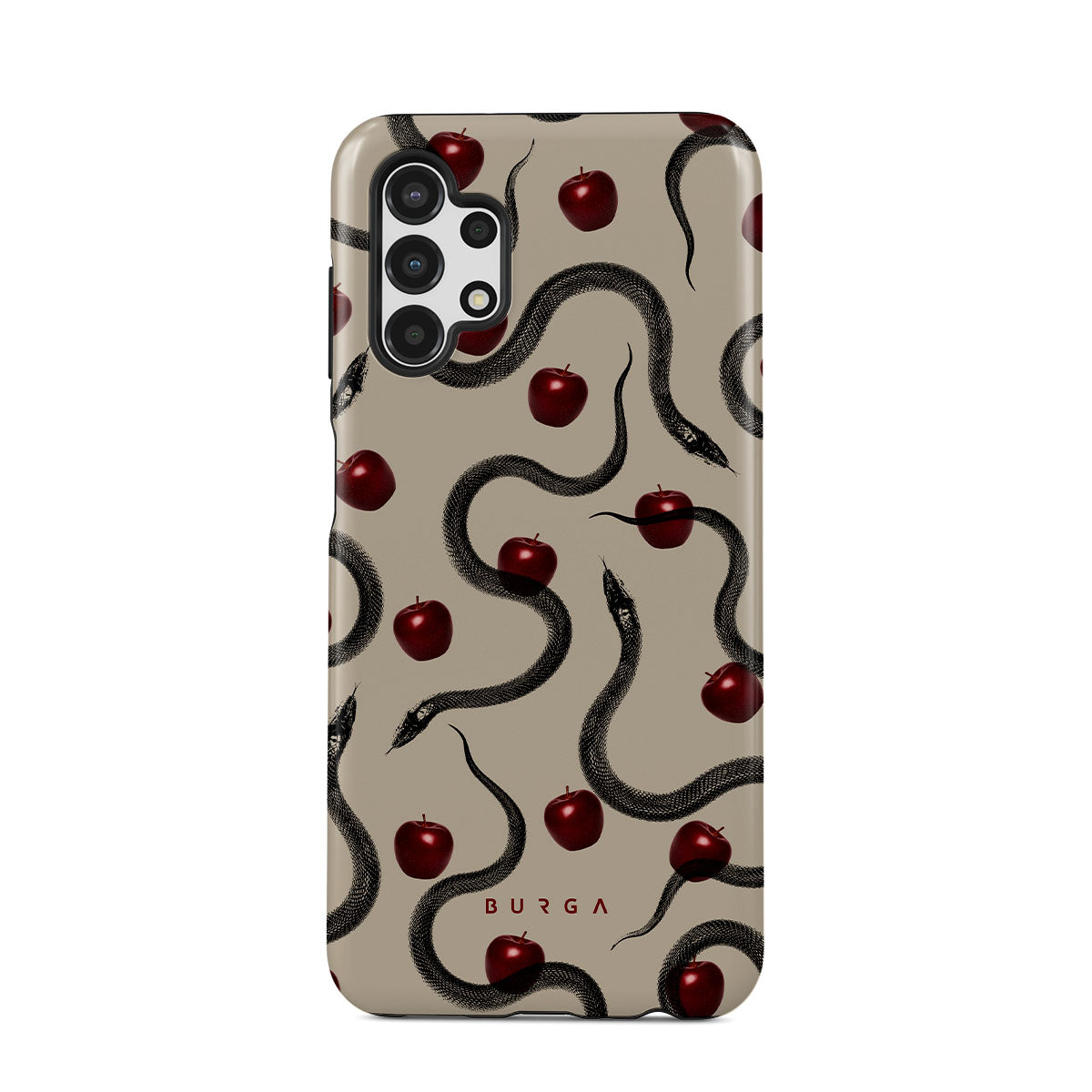 Ce design présente : des pommes rouges brillantes, des serpents enroulés, des tons beige.