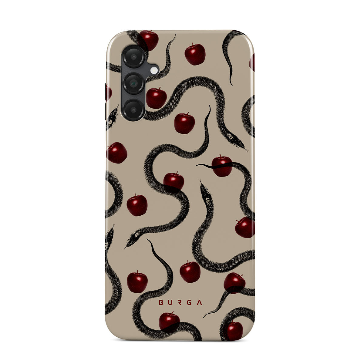 Ce design présente : des pommes rouges brillantes, des serpents enroulés, des tons beige.