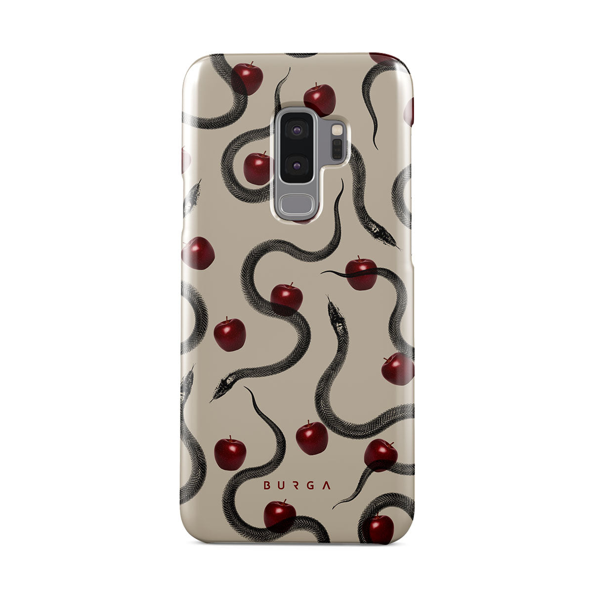 Ce design présente : des pommes rouges brillantes, des serpents enroulés, des tons beige.