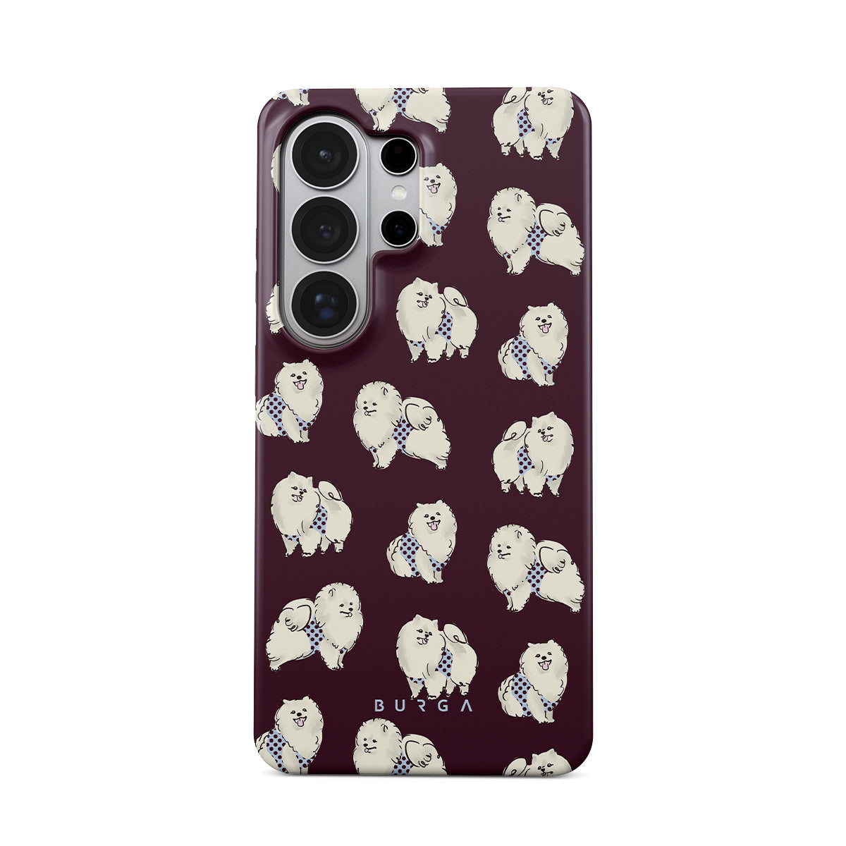 Cette collection est déclinée dans différents designs : des chiens blancs et duveteux sur un fond bordeaux foncé, des caniches, des animaux de compagnie.