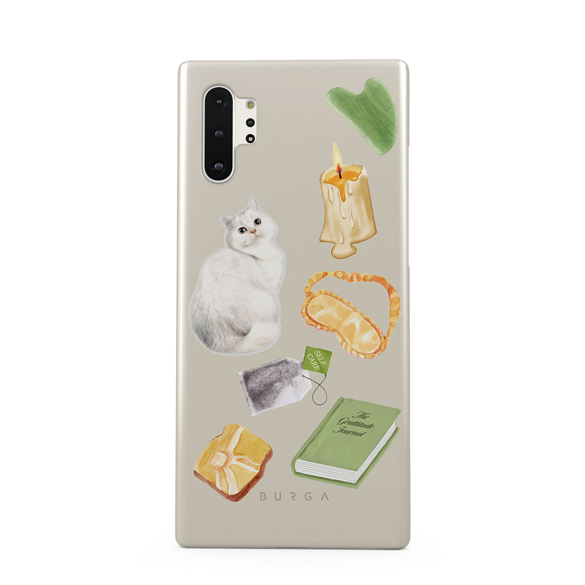 Cette collection est déclinée dans différents designs : chat blanc, livre vert, bougie, barre de Gua Sha, masque de sommeil, sachet de thé, cristal jaune.