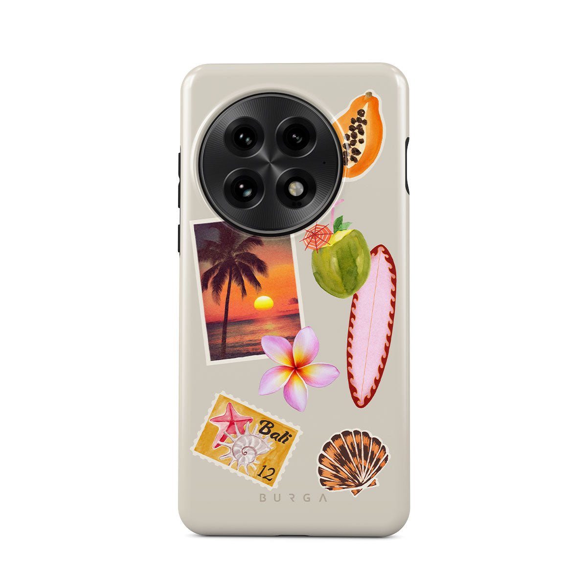 Cette collection est déclinée dans différents designs : photo de coucher de soleil tropical, papaye, noix de coco verte, planche de surf rose, fleur de frangipanier rose, coquillage orange, carte postale de Bali.