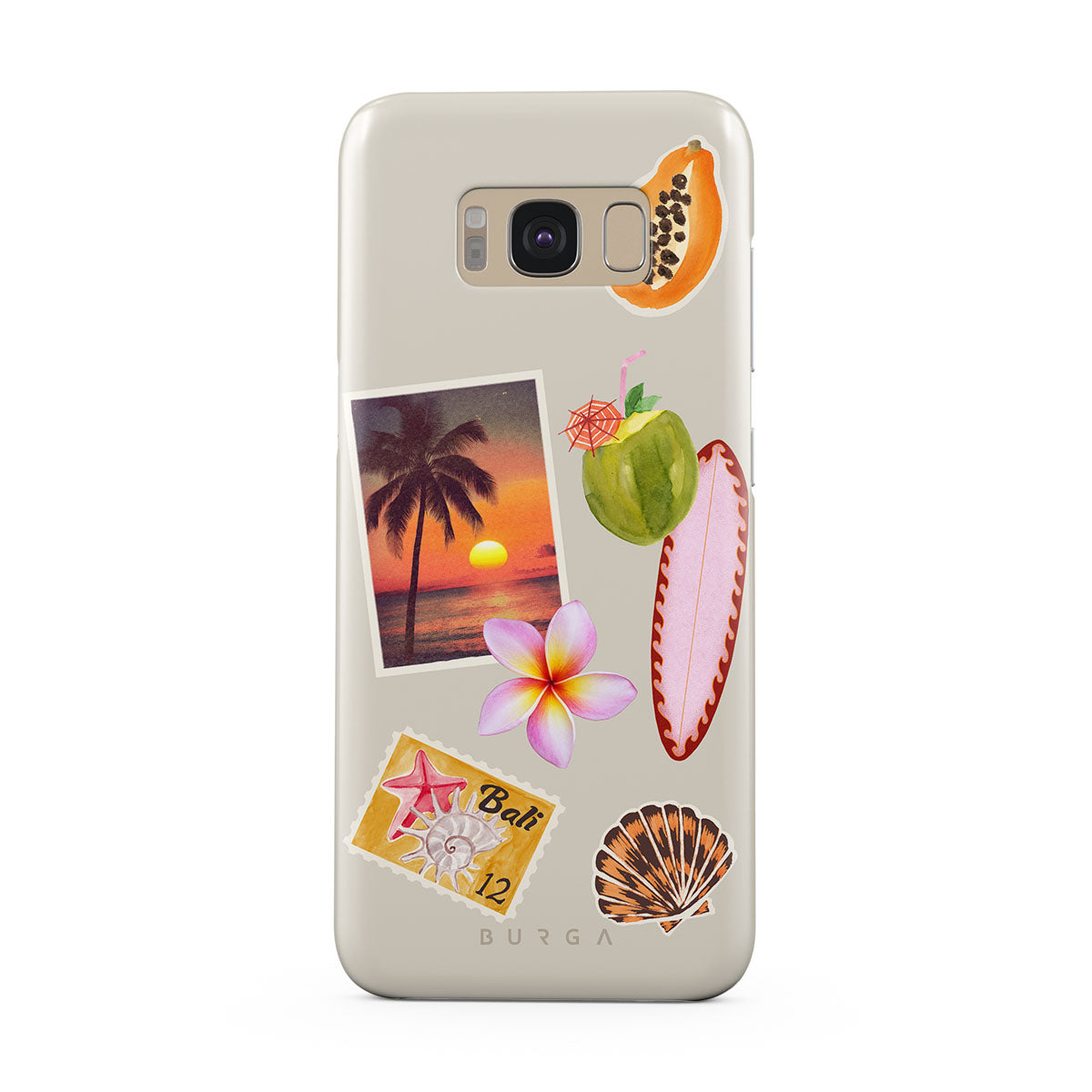 Cette collection est déclinée dans différents designs : photo de coucher de soleil tropical, papaye, noix de coco verte, planche de surf rose, fleur de frangipanier rose, coquillage orange, carte postale de Bali.