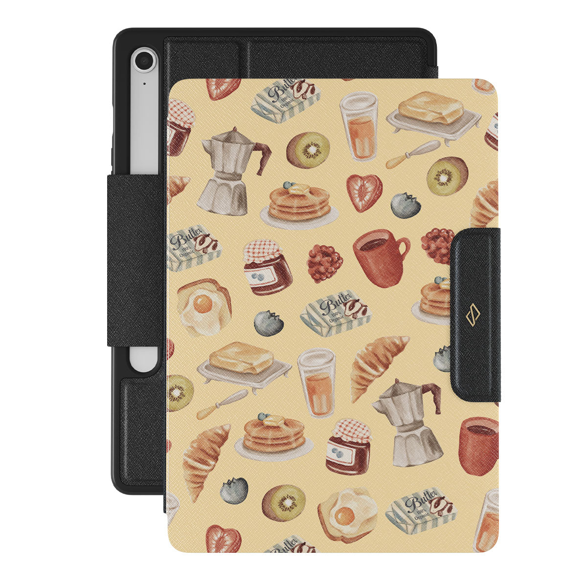 Ce modèle présente : petit-déjeuner, pancakes, confiture, œufs, beurre, café, sucreries, fruits, jus d’orange, croissant